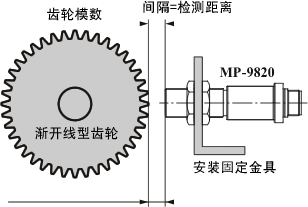 如右圖所示,MP-9820的檢測距離與配套使用的檢測齒輪的模數相關,模數越大可以有效檢測的距離越長。