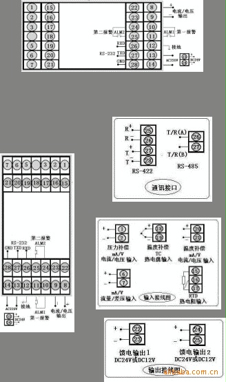 帶補償輸入,通訊方式RS-485,輸出方式為4~20mA,輸入類型為第一路4~20mA,第二路1~5V, 第一報警為下限報警,第二報警為上限報警,無饋電輸出,AC90~265V供電(開關電源),橫表。