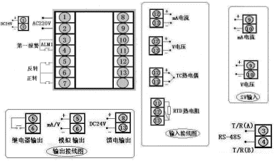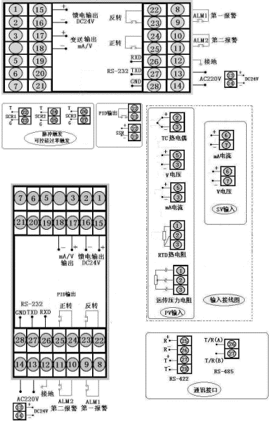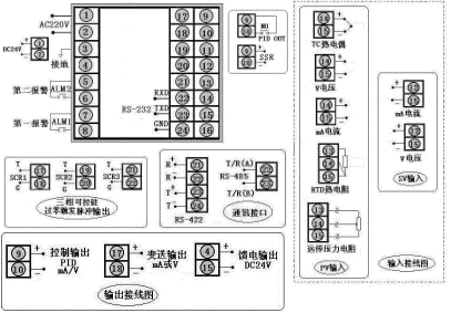 外給定控制,通訊方式RS232,輸出方式繼電器輸出,PV輸入類型為Pt100,SV輸入類型為4~20 mA,第一報警為上限報警,第二報警為下限報警,DC24V饋電輸出,供電方式為直流24V供電。